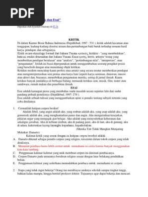 See full list on serupa.id Bagaimana menulis kritik dan esai merupakan perbedaan? Kritik adalah karangan yang akan dirangkum dan berisi tentang baik dan buruknya sebuah karya, tujuannya untuk melakukan pengembangan dan perbaikan dari karya. Selain itu, bisa juga dengan mencantumkan data resmi dari penelitian terkait, misalnya kutipan data yang dihimpun who untuk situasi pandemi. Keduanya merupakan cabang ilmu sastra. Berikut adalah perbedaan kritik dan esai menurut tim kemdikbud (2017, hlm. See full list on serupa.id Apakah pertanyaan dan jawaban tentang esai? Berikut adalah pengertian singkat dan contoh soal mengenai materi bahasa indonesia yang terkait dengan resensi, esai, dan kritik. Dalam pembelajaran ini yang dimaksud kritik adalah kecaman atau tanggapan yang. Berikut ini contoh kritik dan esai puisi tak rindukah kau. See full list on serupa.id Tesis adalah pendapat atau opini umum yang biasanya berupa pengenalan dan deskripsi karya pada kritik atau pengenalan dan definisi umum isu pada esai.