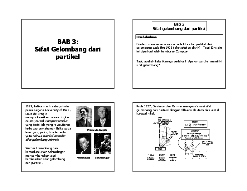 Prinsip ketidakpastian heisenberg pada tahun 1927 seorang ilmuwan jerman bernama werner heisenberg mengemukakan suatu prinsip ketidakpastian yang menyatakan bahwa adalah (hampir) tidak mungkin untuk mengukur dua besaran secara bersamaan, misalnya posisi dan momentum suatu partikel. Tidak mungkin kita mengetahui keduanya yaitu kedudukan dan momentum suatu benda secara seksama pada saat yang bersamaan. <br />jadi, jika nilai posisi elektron diketahui dengan tingkat akurasi yang tinggi, maka nilai momentum elektron akan tidak pasti, dan sebaliknya.<br /> 5. Hipotesa de broglie menyatakan bagi semua partikel yang bergerak dengan momentum p, terkait dengan suatu gelombang λ. Ukuran sebuah persegi panjang adalah 2 ± 0, 1 cm dan 10 ± 0, 5 cm, maka ketidak pastian luasnya adalah.